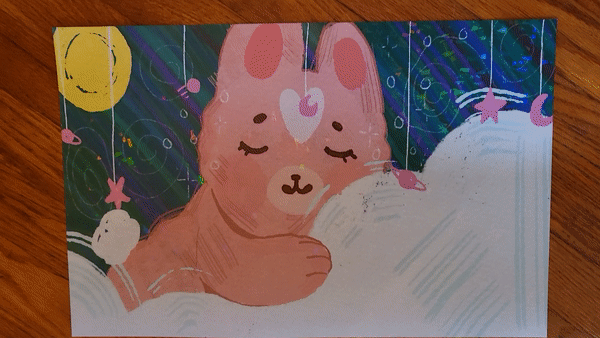 Sweet dreams and with his head in the clouds, this Strawbunny print is perfect for decorating any cozy, gentle, sweet room ♡ Print measures 11" x 17" (in inches) and is adorned and printed with holographic material around it, so it really shines and sparkles in the light very prettily!